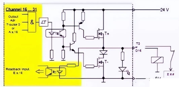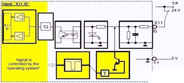 安全PLC的自检测体现在方方面面,包含CPU处理的自检测,电源监视的自检测,安全输入输出点的电路板状况自检测。在此我们介绍一下安全输入输出的设计是如何体现了自检测这一安全理念设计。