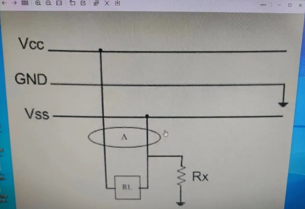 当负极发生对地阻抗为Rx的绝缘异常之后,A(给负载RL供电的正负电源线电流大小矢量和)处电流大小为:I=Vss/Rx。