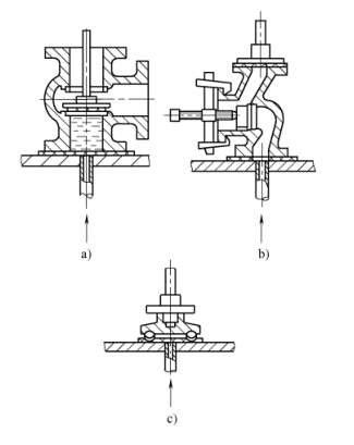 水、蒸汽及压缩空气用阀门,以水为试验介质进行严密性试验;氨系统用各种阀门,应以压缩空气为介质进行严密性试验。严密性试验的试验压力为阀件的公称压力。阀门严密性试验如图3所示。试验时,应关闭阀门,介质由通路一端引人,在另一端检查其严密性(见图3a)。如果是闸阀,则两端均应分别做上述实验,或者采用图3b所示的方法,这样只需做一次实验。阀体及阀杆的接合面以及填料部分的严密性试验,应在关闭件开启、通路封闭的情况下进行(见图2)。