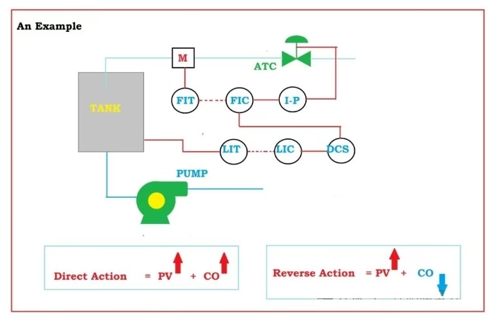考虑一个流量控制阀安装在工艺输入端的情况,使用ATC控制阀来调节流量,油箱液位作为过程变量。如果油箱液位升至设定点以上,为了修正误差,控制器输出必须增加以关闭阀门,因此在这种情况下,控制器应选择直接动作。相反,如果使用的流量控制阀是ATO而非ATC,则控制器应选择反向动作。