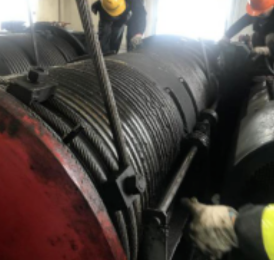 第五步:将旧钢丝绳连着牵引绳一直放到地面上,拆除旧绳,将牵引绳与新钢丝绳对接,利用电机滚筒将新绳往上拉,直至牵引绳全部从滚筒上脱出。