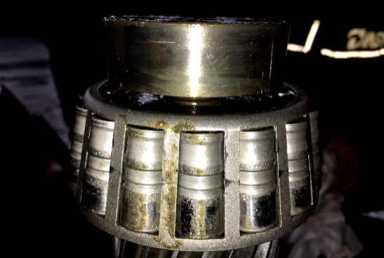 2.中间轴上部轴承目测无明显损坏,中间轴下部轴承滚动体研磨损伤。