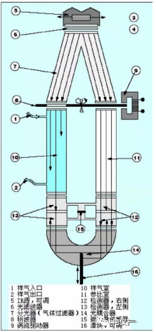 一个被加热到大约 700°C的红外光源5发出的光被分光器7分成两路相等的光束(样气光束和参比光束),该红外光源可以左右移动以平衡光路系统。同时分光器也可以起到滤波气室的作用。