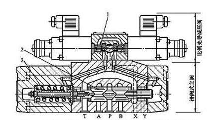 减压型先导阀+主阀弹簧定位型电液比例方向节流阀的结构原理图。其先导阀能输出与输入电信号成比例的控制压力,与输入信号极性相对应的两个出口压力,分别被引至主阀芯2的两端,利用它在两个端面上所产生的液压力与对中弹簧3的弹簧力平衡,使主阀芯2与输入信号成比例定位。采用减压型先导阀后不必像原理相似的先导溢流型那样,持续不断地耗费先导控制油。先导控制油既可内供,也可外供,如果先导控制油压力超过规定值,可用先导减压阀块将先导压力降下来。主阀采用单弹簧对中形式,弹簧有预压缩量,当先导阀无输入信号时,主阀芯对中。单弹簧既简化了阀的结构,又使阀的对称性好。