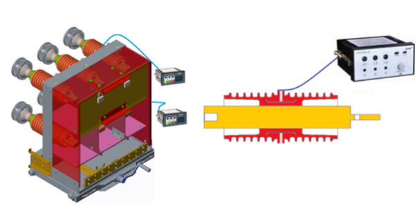 还有带内部电压传感器的主触点套管与手车上的电压指示器连接,当主触点有电压时,带电指示灯亮;