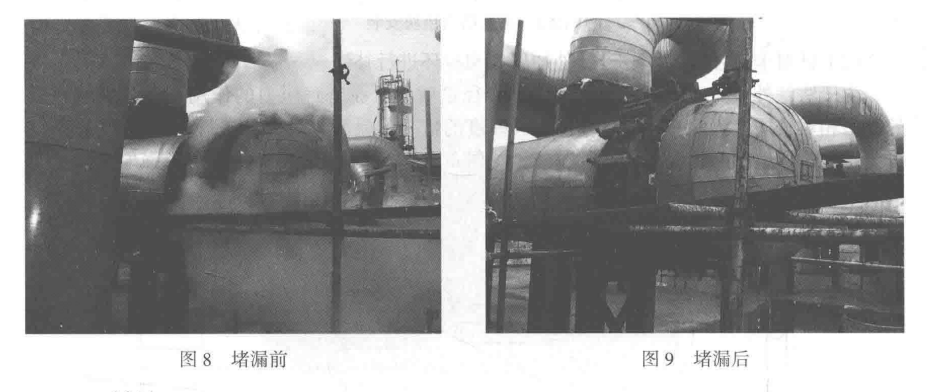 某石化硫磺装置3.5MPa蒸汽换热器E5105头盖法兰发生严重泄漏,若不能及时处理、消除泄漏,装置将被迫停工,现场泄漏状况见图8。根据现场情况,按上述设计要求设计卡具。注意现场的每一个细节,比如有些法兰螺帽不一样大,先进行了清点和测量,并设计了二种不同的扣在螺帽上的拉环。现场施工作业时,一切均很顺利,堵漏很成功。堵漏完毕后,堵漏效果见图9。