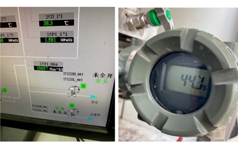 接工艺通知,压力变送器 25FT-004显示偏低,中控指示 15657nm3/h,现场查看变送器显示44.3%,该表正常范围应在 17000-19000 之间。