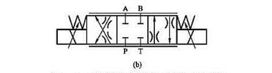 电液比例方向阀由2个比例磁铁,阀体3,阀芯4,对中弹簧组成。当电磁铁1通电时,阀芯右移,P与B通,A与T通,阀口开度与电磁铁1输入电流成比例;当电磁铁6 通电时,阀芯向左移,P与A通、B与T通,阀口开度与电磁铁6的输入电流成比例。这种阀的四个控制边有较大的遮盖量,弹簧具有一定的预压缩量。阀的稳态控制特性有较大的中位死区。另外由于摩擦力及阀口液动力干扰的影响,阀芯定位精度不高,尤其是在高压大流量工况下,稳态液动力的影响更突出。为提高电液比例方向阀的控制精度,可采用位移电反馈型电液比例方向节流阀。